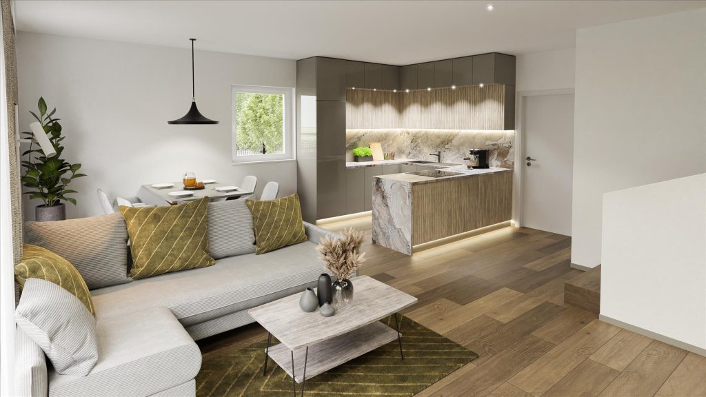 Velkoformátová okna směřující do zahrady, podlahové vytápění pomocí tepelných čerpadel, možnost instalace fotovoltaik na zastřešení a mnohé další jsou základními prvky vybavení projektu. Vše s důrazem na maximální funkčnost a jednoduchost na údržbu.